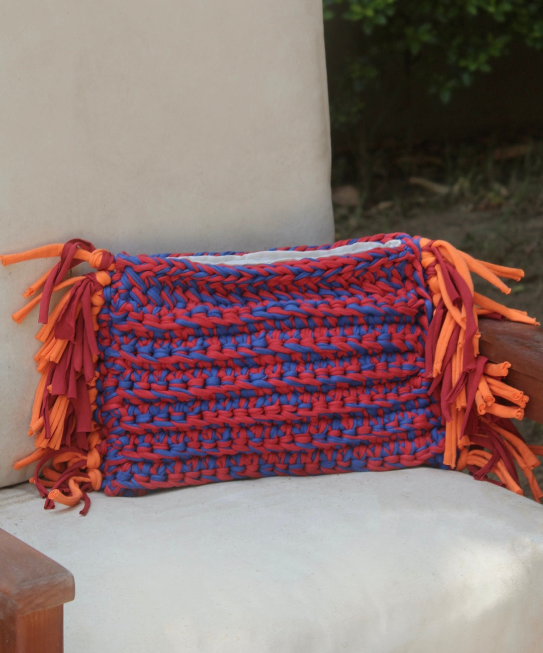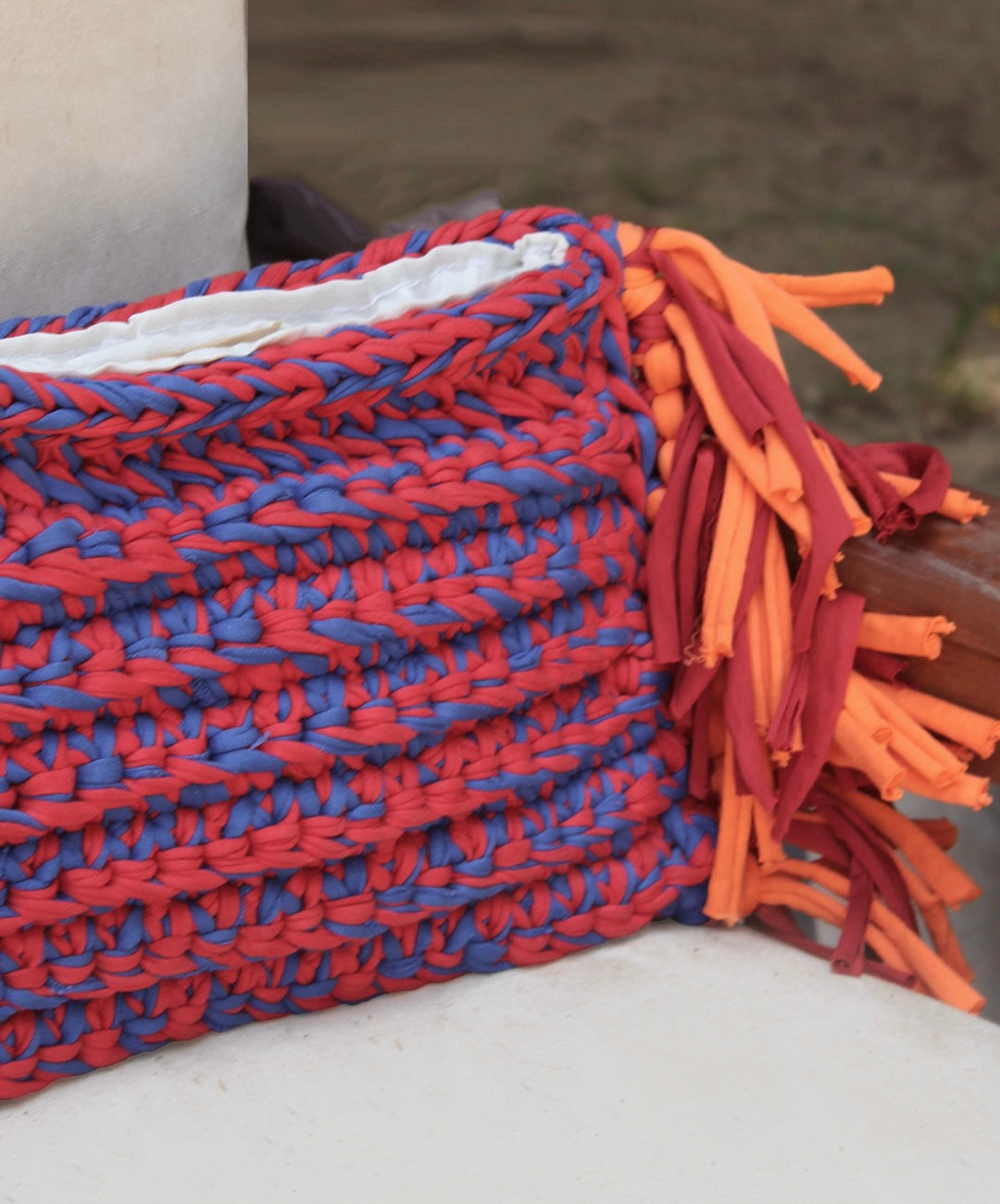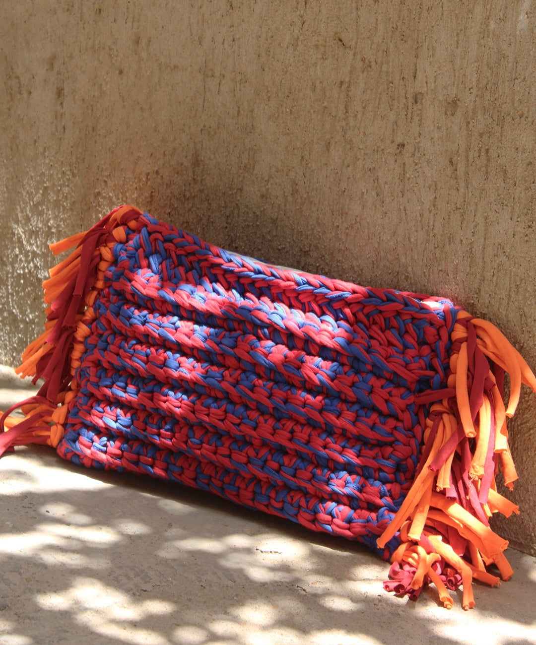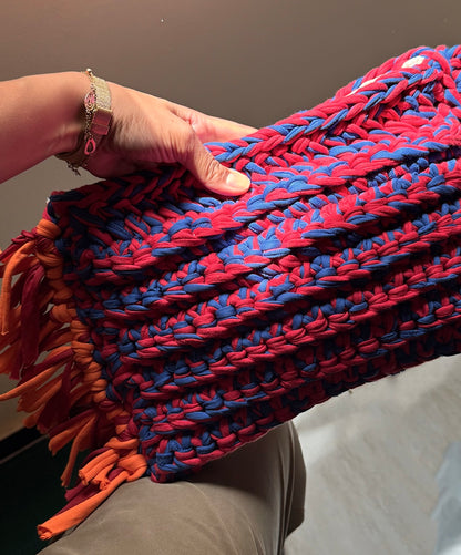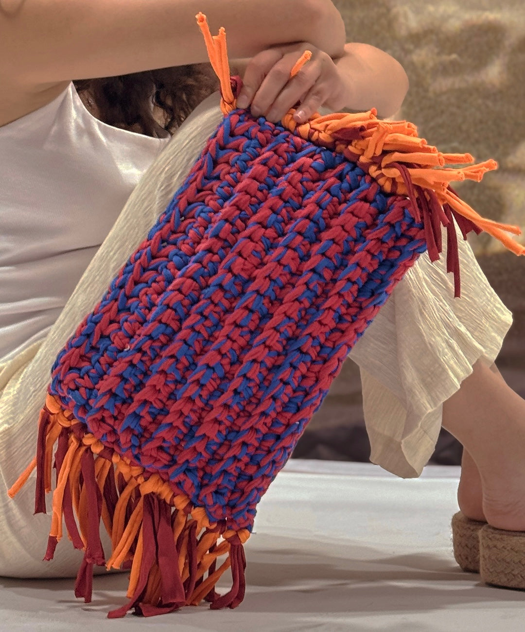 Make a statement with ease. This oversized macramé clutch blends laid-back texture with elevated form. Hand-crocheted with chunky stitches and finished with soft fringe at both ends. Roomy enough for all your essentials!