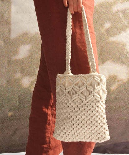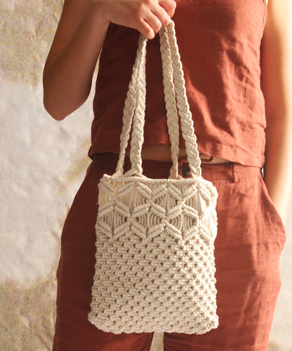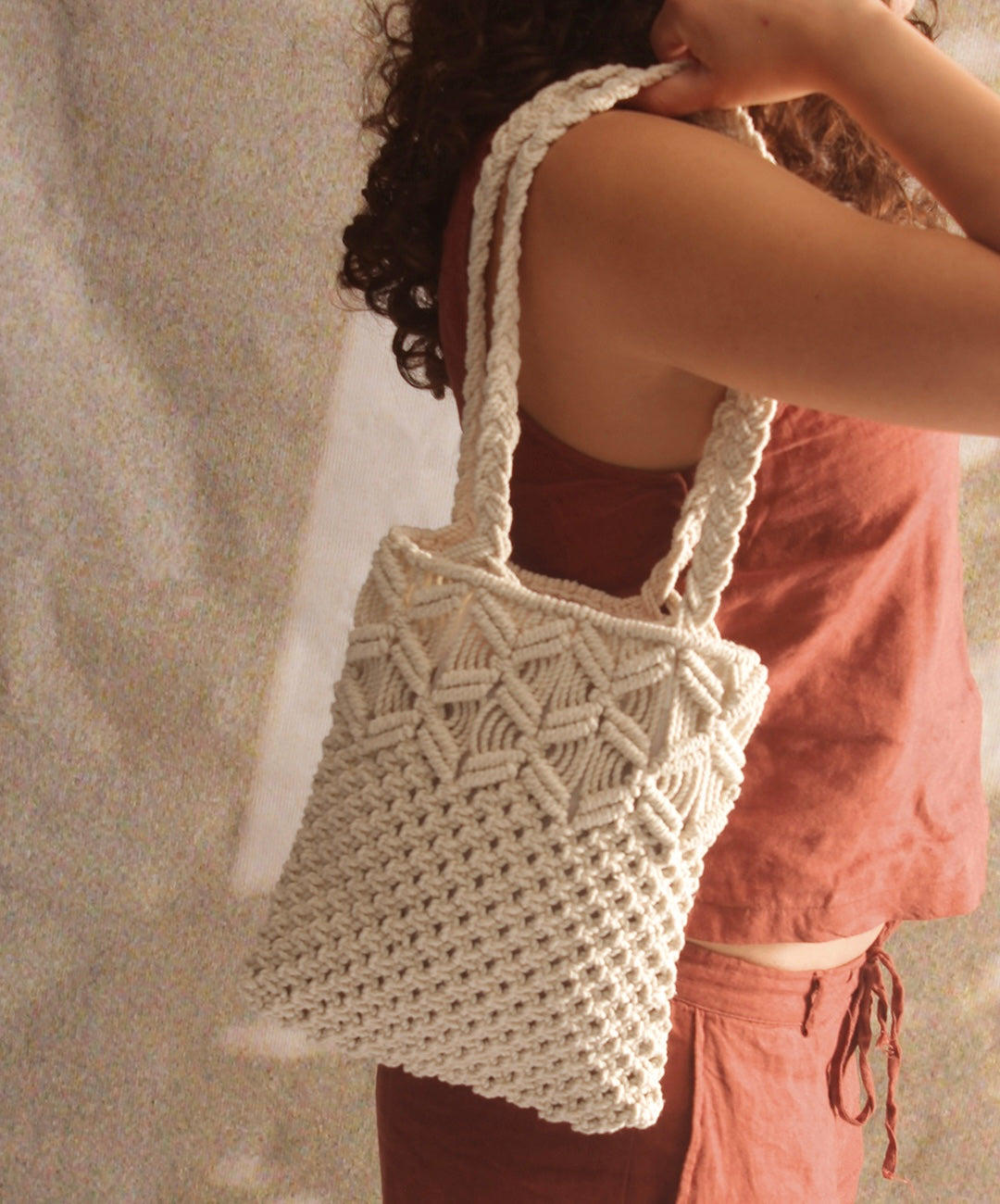 Delicate yet durable, the Mini Macramé Tote is a handmade essential with just the right touch of charm. Featuring intricate knotted detailing and sturdy braided straps, it’s the perfect compact carry-all for your essentials